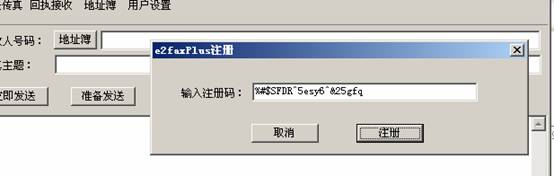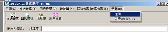选择“注册“菜单项进入注册对话框,输入“注册码”即可完成注册,e2faxPlus注册码请向“埃康软件“销售人员索取。