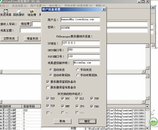从菜单项“用户设置“进入设置界面,需要设置的参数主要有:用户名(注意:需要完整email地址格式)、密码(FAXmanager系统用户缺省密码为:123456)、FAXmanager系统服务端的IP地址、smtp端口号(缺省为:25)、pop3端口号(缺省为:110)。自动发送/手动发送选项是指传真被送入“待发队列”后是否自动发送出去,建议选择自动发送,选择手动发送有一个好处是:在发出去之前还可以修改或者删除掉。一般建议设置服务器保留回执备份,这样不影响用户使用多种客户端发送方式。最后就是设置传真件发送的格式支持。
