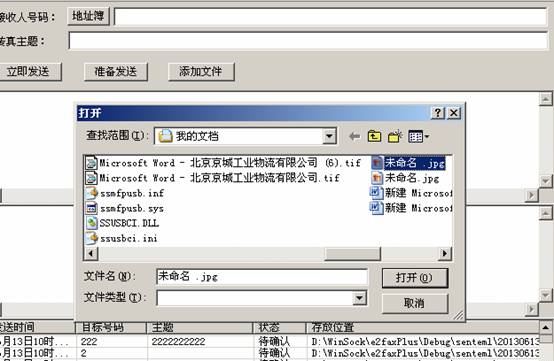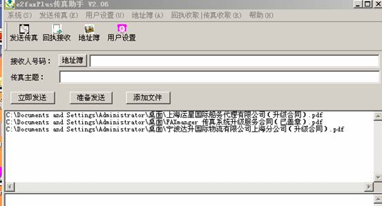 按界面中的 [ 添加文件 ]按钮,可以将需要发送的传真稿件(譬如:WORD文件、execl文件、pdf文件、txt文件等添加到“传真稿件队列”中,当然也可以用鼠标将需要发送的保稿件直接拖拽到“传真稿件队列”中,可以添加多个文件,在“传真稿件队列”中可以用鼠标右键菜单进行打开阅读、删除等操作。在确认您要发送的稿件无误之后,可以输入需要发送的目的传真号码(可以是多个,中间用“;”隔开),可以从地址簿中选择传真号码。然后在输入主题内容,之后就是按 [ 准备发送 ]按钮,便可以生成传真件,生成好的传真件会进入“传真待发队列”中待发,如果设置了“自动发送”的话,便会直接发送待发传真件,否则,需要按 [ 立即发送 ]按钮之后才会发送待发队列中的传真件。刚才描述的过程具体的界面请见下列截图:
