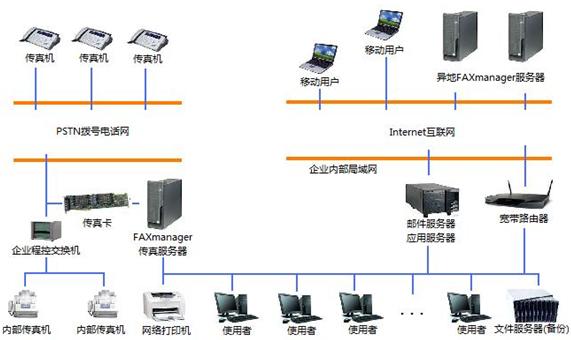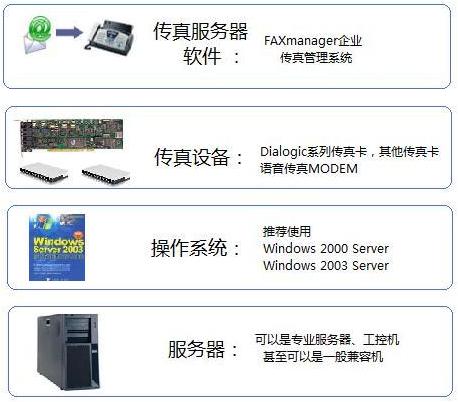 FAXmanager企业传真管理系统是纯软件系统,由其组成的传真服务器主要有如下四个部分构成:服务器硬件+操作系统平台软件+传真设备(含驱动程序和传真线路)+FAXmanager传真管理系统(软件)。
