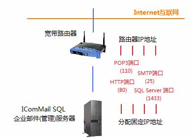 安装IComMail SQL 系统的服务器需要接入企业的局域网,需要分配一个IP地址,这样,企业内部局域网中的所有用户都可以访问到,当用户使用Outlook等邮件客户端软件来收发邮件时,SMTP/POP3 地址都需要填写此IP地址,服务器需要可以访问Internet,以便与企业邮局等交换邮件数据,如果需要支持移动办公的需求,这还需要在企业接入Internet互联网的宽带路由器设备上做端口映射:SMTP端口(25),POP3端口(110),HTTP端口(80)、SQL Server 端口(1433),具体如下图所示: