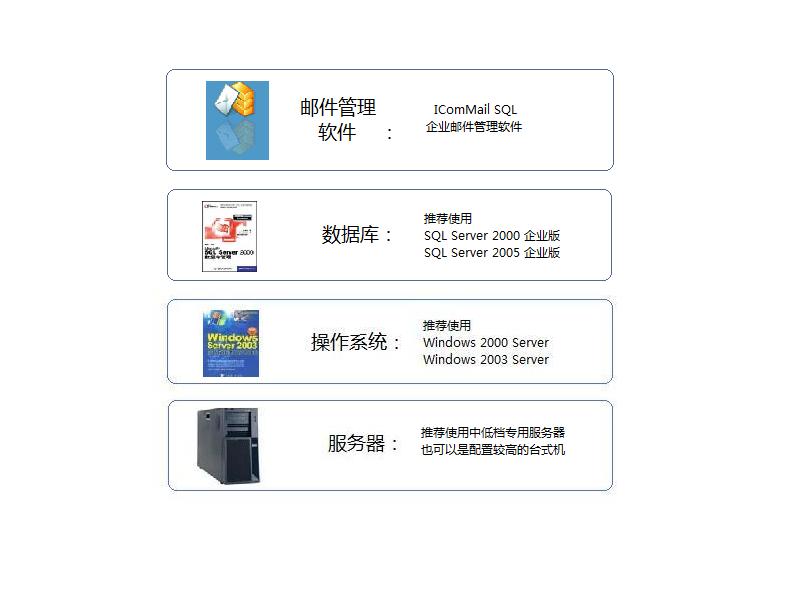 IComMail SQL企业邮件管理系统主要有如下四个部分构成:服务器硬件+操作系统平台软件+数据库系统+IComMail SQL企业邮件管理软件。